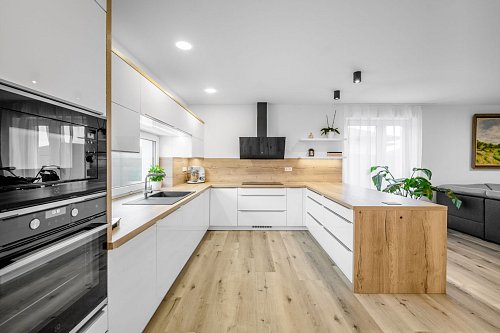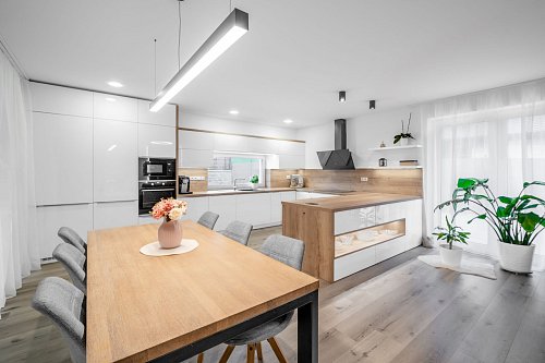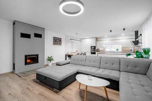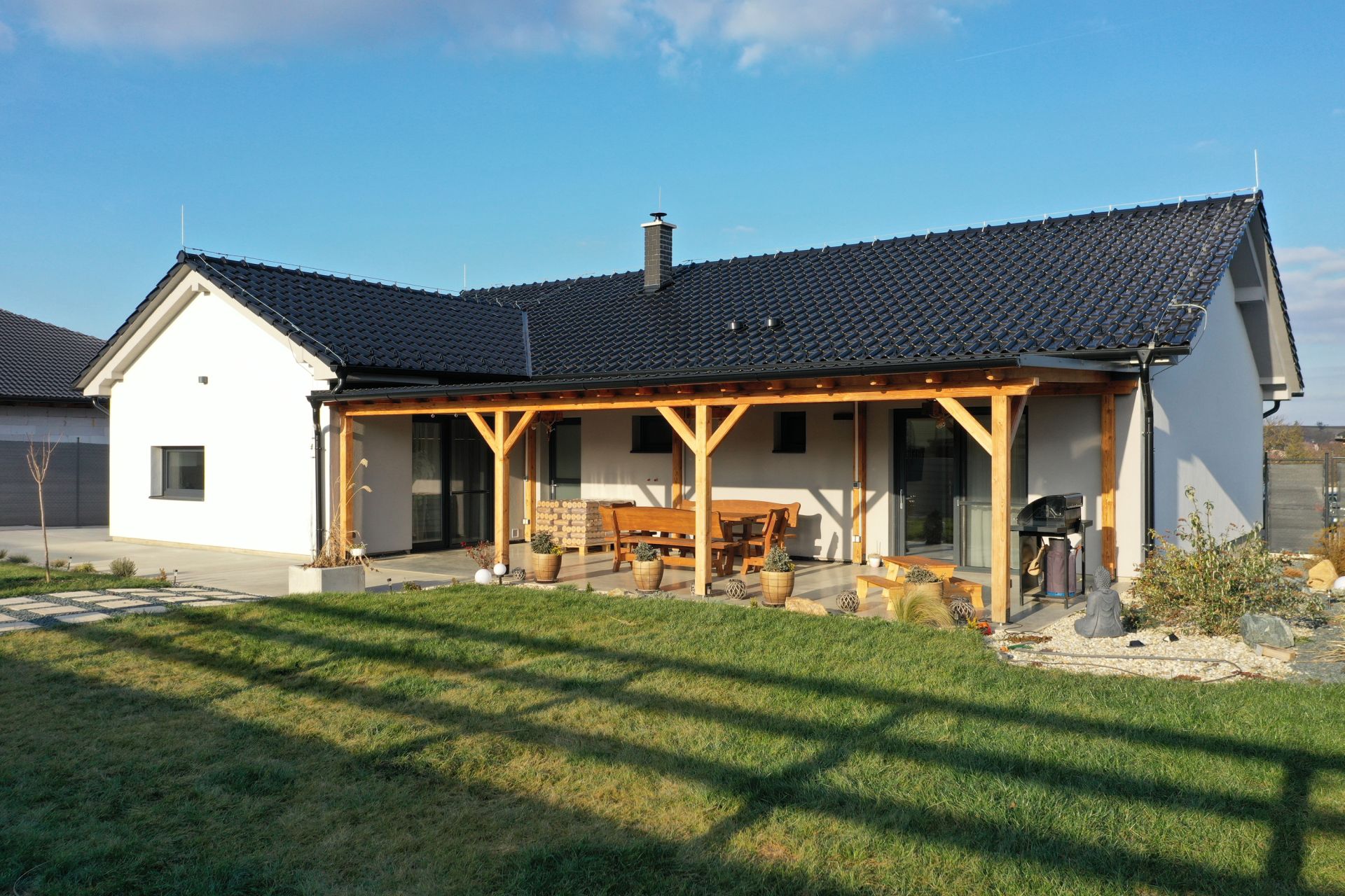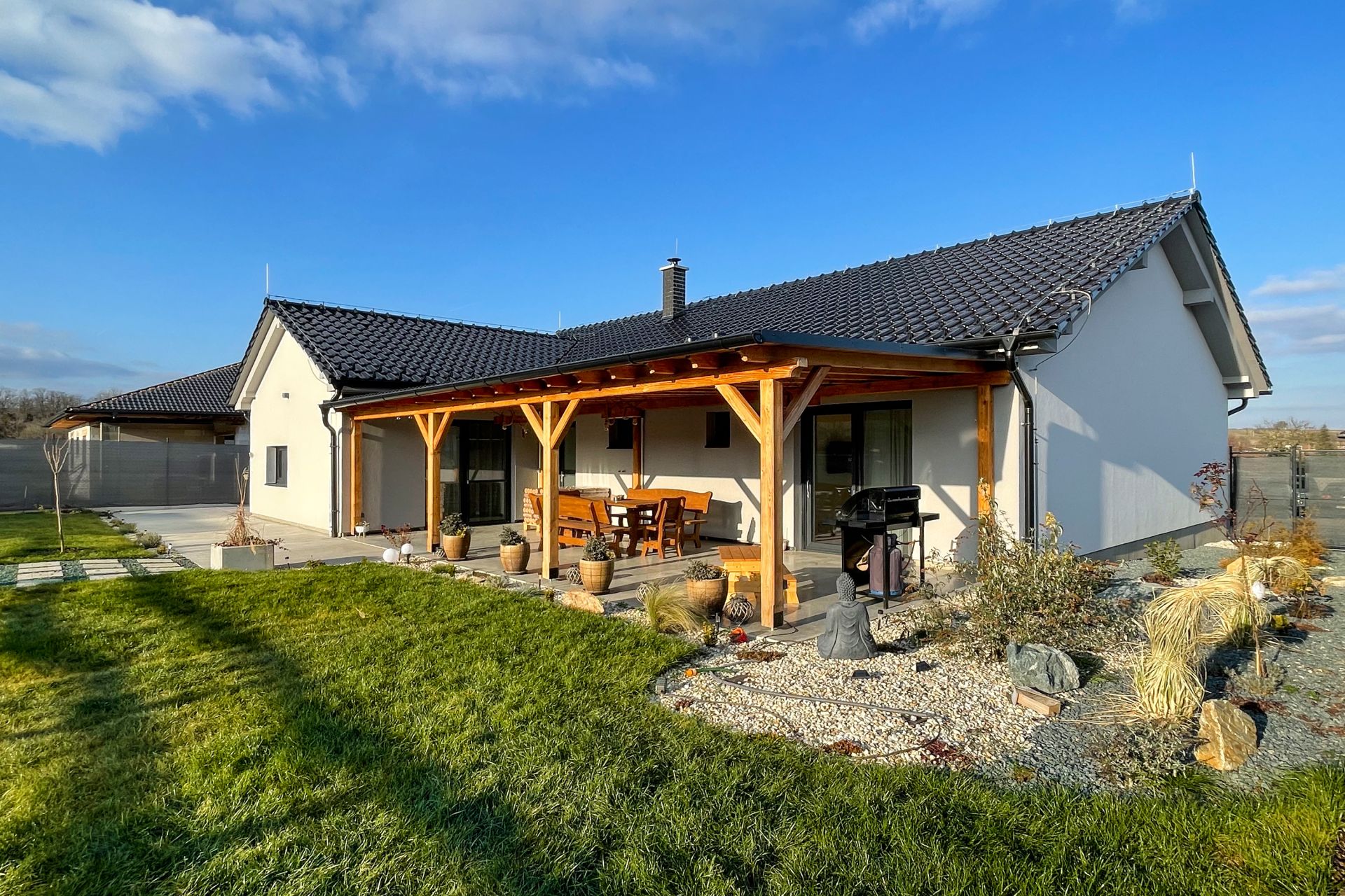 Okna jsou z vysoce kvalitních okenních profilů – 6ti komorové s trojitým zasklením. V domě je položena vinylová podlaha, dekor přírodního dřeva ve venkovské rustikální úpravě. Koupelny jsou vybaveny veškerou sanitou od firmy Grohe, velkoformátové obklady italské výroby. Orientace oplocené zahrady je na jih včetně 40 m2 zastřešené terasy a retenční nádoby na 10 m3 s přepadem do vsakovací jímky.