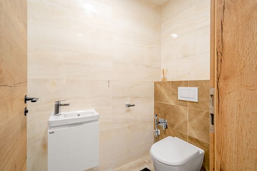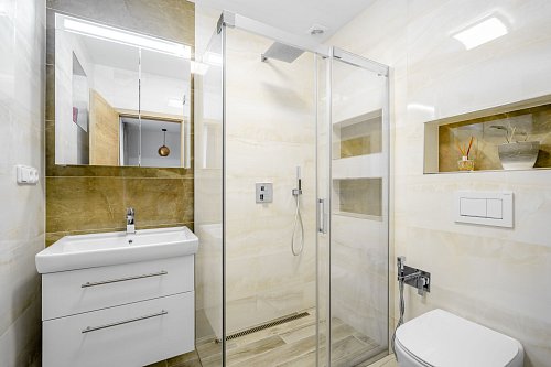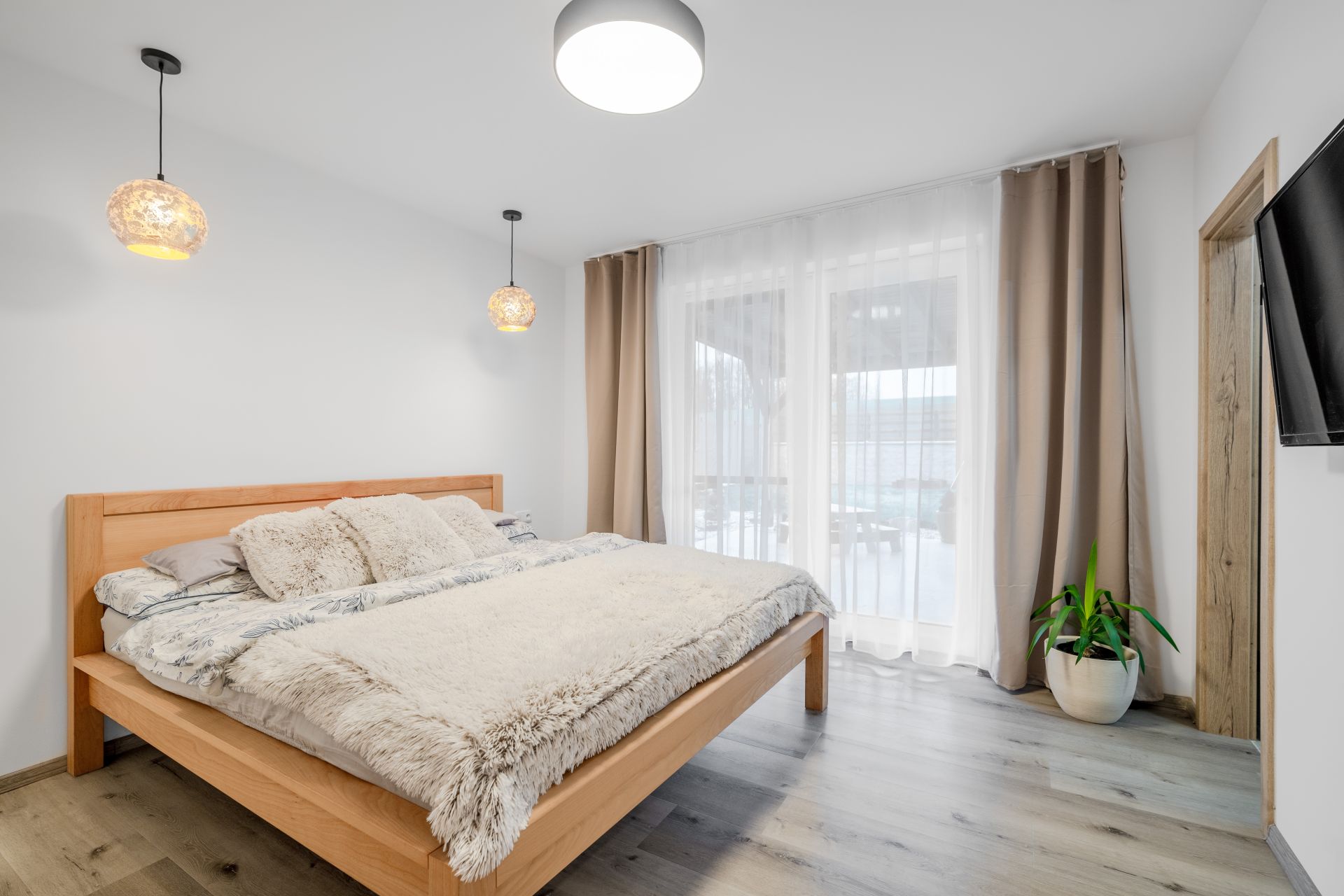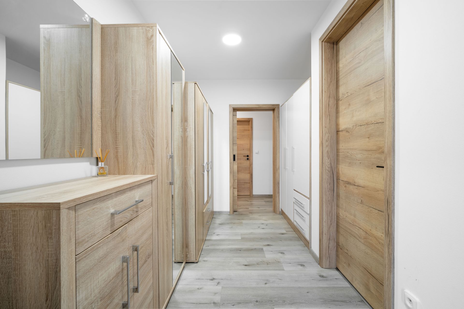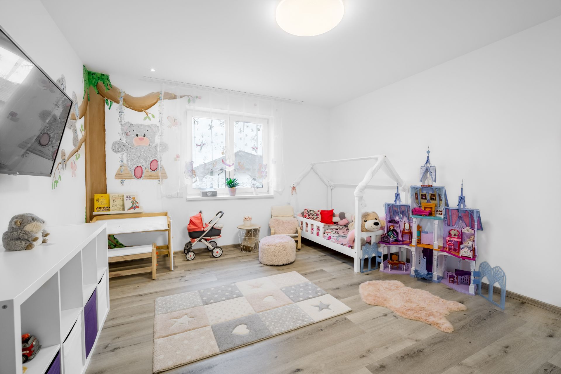 Okna jsou z vysoce kvalitních okenních profilů – 6ti komorové s trojitým zasklením. V domě je položena vinylová podlaha, dekor přírodního dřeva ve venkovské rustikální úpravě. Koupelny jsou vybaveny veškerou sanitou od firmy Grohe, velkoformátové obklady italské výroby. Orientace oplocené zahrady je na jih včetně 40 m2 zastřešené terasy a retenční nádoby na 10 m3 s přepadem do vsakovací jímky.
